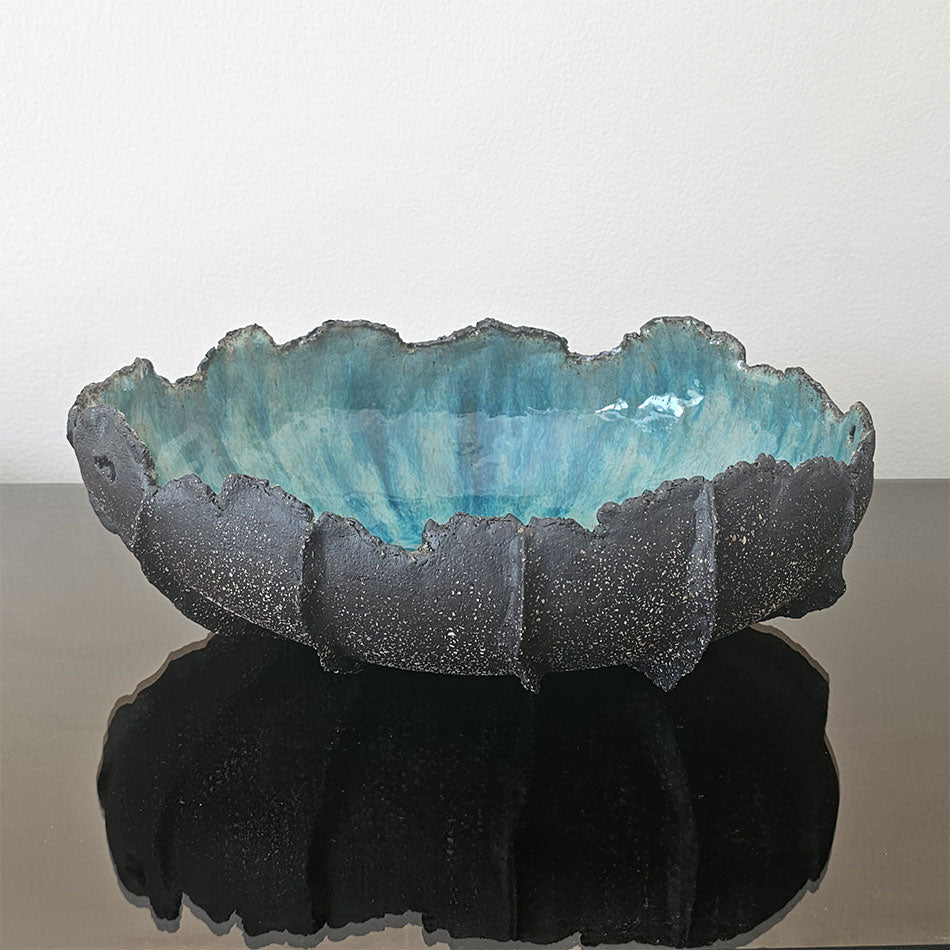 Karine Legay is a french Ceramist. Her artworks are always inspired by nature, natural elements like lava, earth and water. She likes to focus on contrasts between organic shapes and very smooth and shinny glazes, betweendark clay and bright turquoise color, or between pure shapes and very rough textures. She has recently been selected to work on commissions for two luxury hotels murals and decorative pieces. One of her creations has been shortlisted by the Dubai Ceramic Award 2020. Her series "When lava meet the ocean 1" has been exhibited at SIKKA ART FAIR 2022
